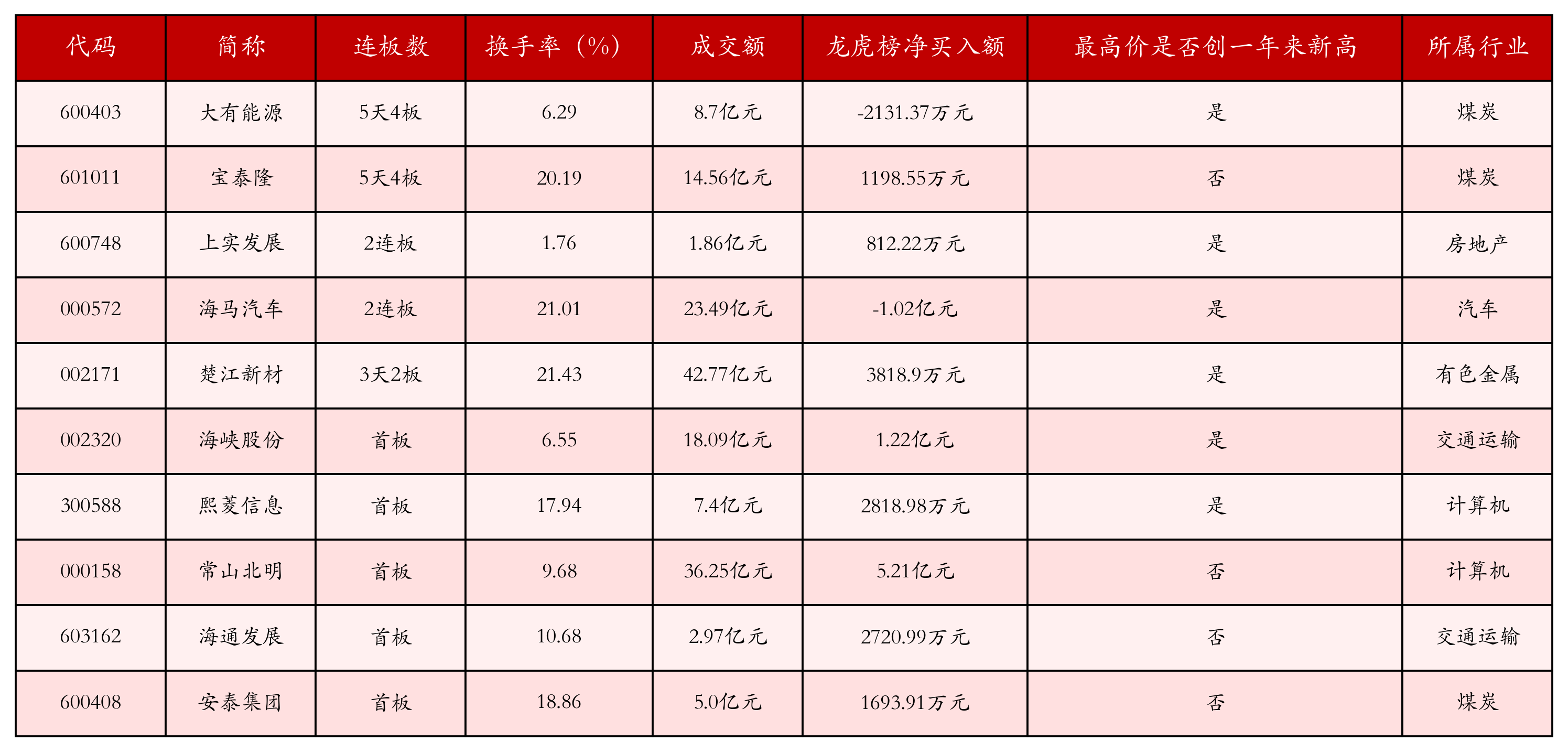 截至10月16日收盘,上证综指上涨0.1%,收于3916.23点,深证成指下跌0.25%,收于13086.41点,创业板指上涨0.38%,收于3037.44点。今日沪深两市A股共计54只涨停,综合当前连板数以及当日龙虎榜数据,其中较为强势的前三只个股分别为:大有能源(600403)、宝泰隆(601011)与上实发展(600748)。今日强势个股前10位具体数据见下表: