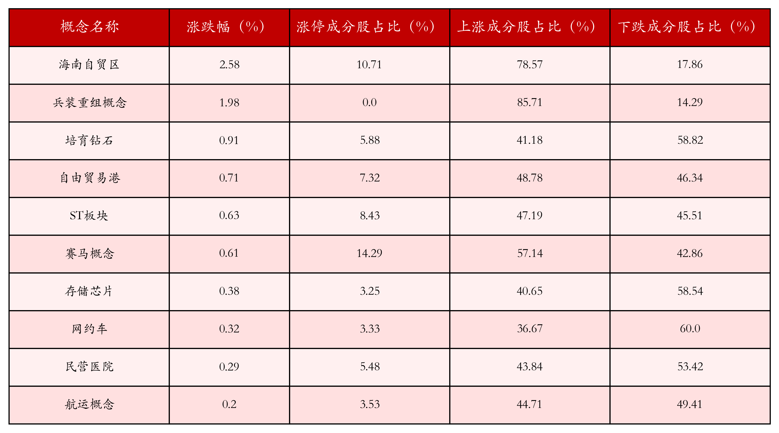 根据A股概念涨跌幅与所对应的股票池综合分析,涨幅靠前的三个概念板块分别为:海南自贸区、兵装重组概念与培育钻石。排名前10位的概念板块相关数据见下表: