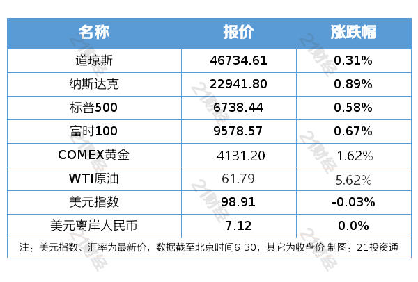 隔夜外盘纽约股市三大股指10月23日上涨。截至当天收盘,道琼斯工业平均指数比前一交易日上涨144.20点,收于46734.61点,涨幅为0.31%;标准普尔500种股票指数上涨39.04点,收于6738.44点,涨幅为0.58%;纳斯达克综合指数上涨201.40点,收于22941.80点,涨幅为0.89%。
