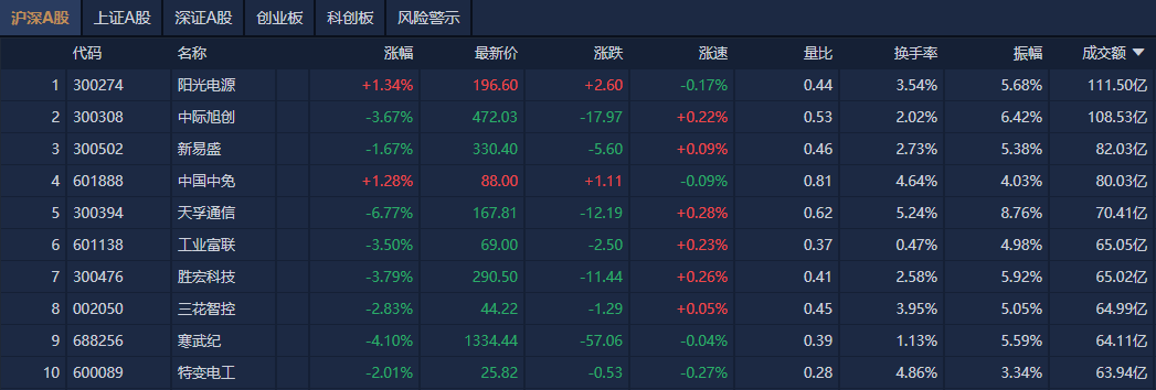 个股方面,阳光电源成交额超111亿元居首,中际旭创、新易盛、中国中免成交额靠前。