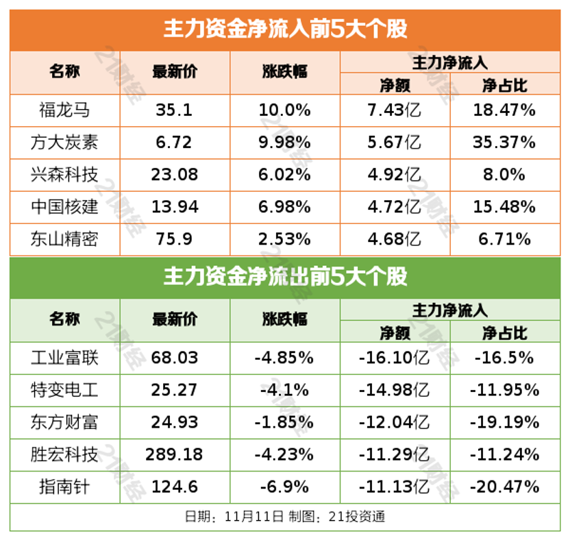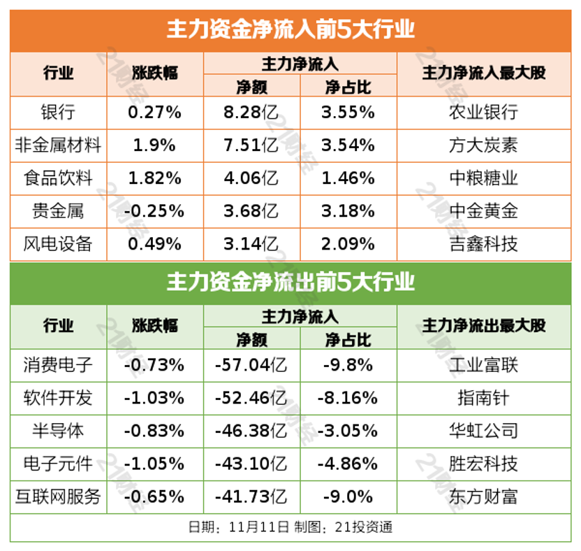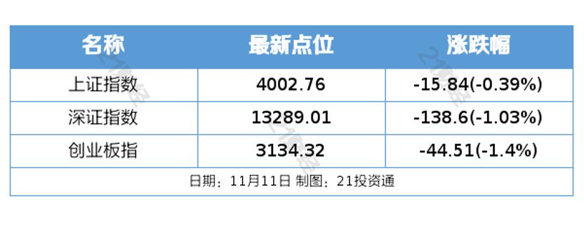 11月11日,市场全天震荡调整,三大指数高开低走。截至收盘,沪指跌0.39%,深成指跌1.03%,创业板指跌1.4%。沪深两市成交额不到2万亿元,较上一个交易日缩量1809亿元。