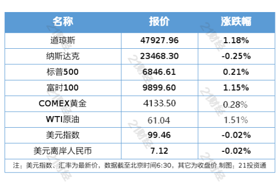美股三大指数收盘涨跌不一,道琼斯指数涨1.18%创纪录新高,标普500指数涨0.21%,纳斯达克综合指数跌0.25%。芯片股普跌,美光科技跌超4%,ARM跌超3%,英伟达、AMD、应用材料跌超2%。大型科技股涨跌互现,苹果涨超2%,奈飞涨超1%,甲骨文跌超2%,特斯拉跌超1%。