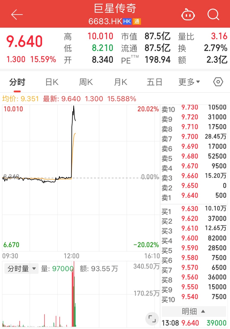 11月12日,港股“周杰伦概念股”巨星传奇(06683.HK)午后股价直线拉升,盘中一度涨超20%,截至13时08分,报9.64元/股,涨幅为15.59%。这波强势上涨源自公司午间的一纸公告,公司与机器人公司宇树科技成立合资企业,共同开发消费级IP机器人。