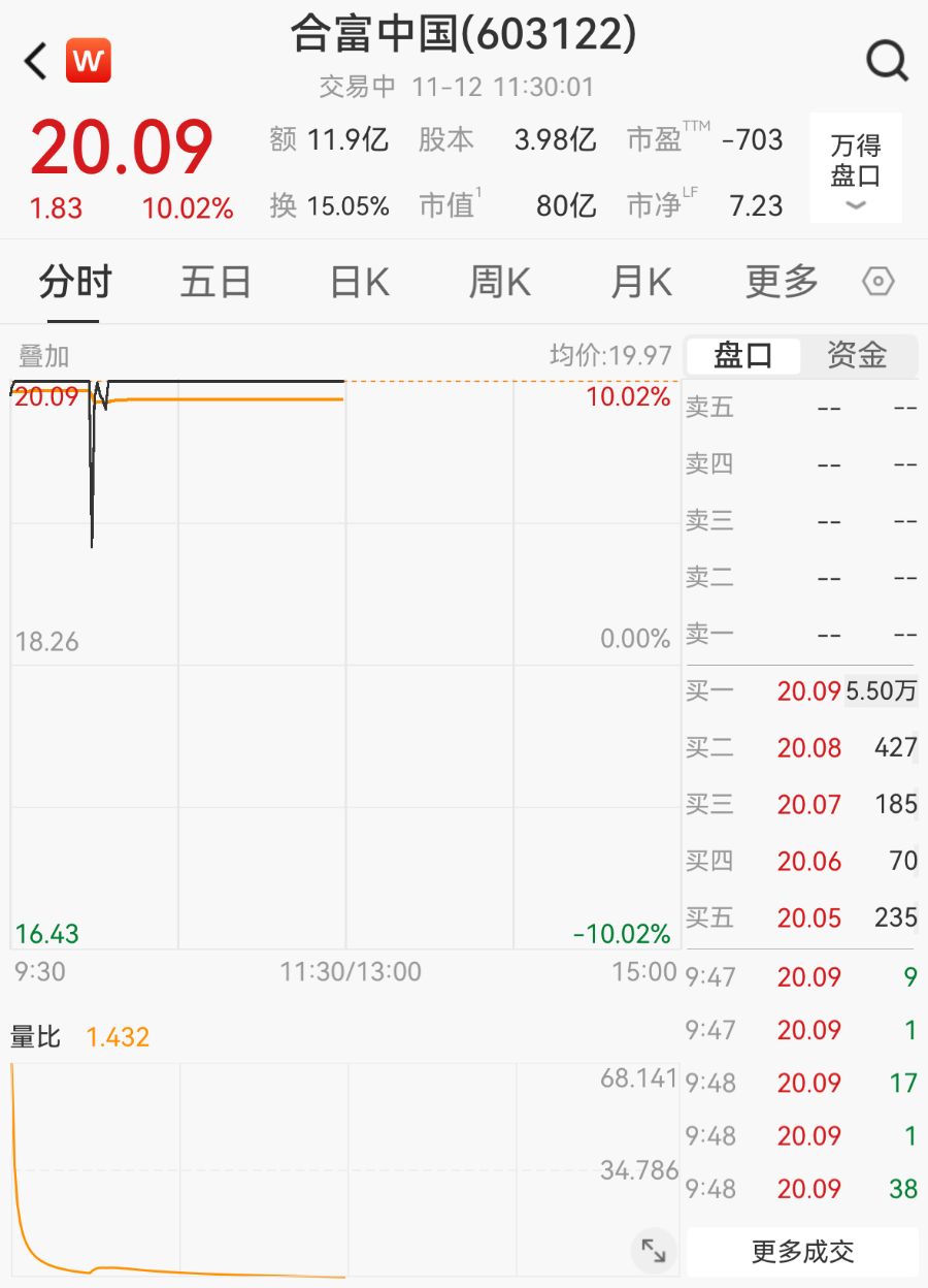 在连发9道风险提示后,11月12日,合富中国(603122.SH)再度涨停,截至午间收盘,报20.09元/股,总市值为79.97亿元。在最近12个交易日内,合富中国共斩获11个涨停板,股价涨幅超过200%,受到市场广泛关注。