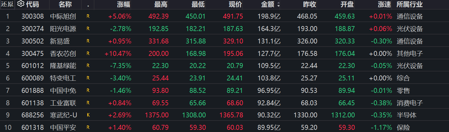 中际旭创成交额居首,为198.9亿元。其后是阳光电源、新易盛、香农芯创、隆基绿能,成交额分别为164.3亿元、131.1亿元、127.7亿元、109.5亿元。