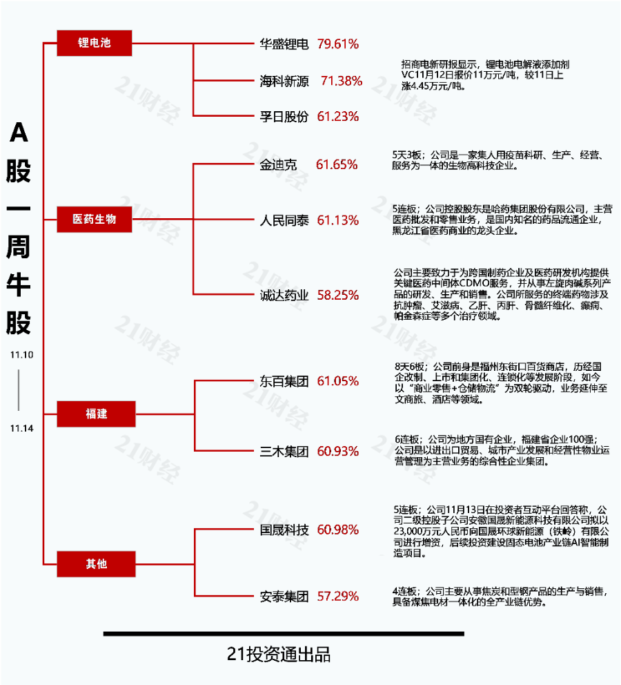 本期牛股榜中,华盛锂电(688353.SH)以79.61%的周涨幅夺魁,海科新源(301292.SZ)以71.38%的涨幅位居第二,金迪克(688670.SH)、孚日股份(002083.SZ)、人民同泰(600829.SH)、东百集团(600693.SH)周涨幅超61%。本期牛股榜十只个股过去一周累计涨幅均超过57%。