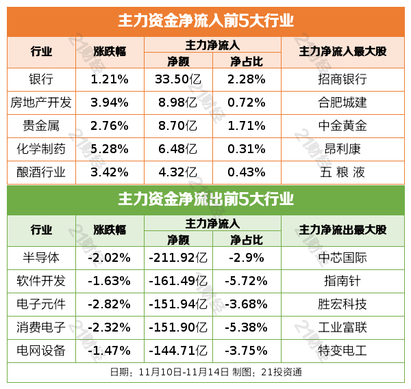 过去一周(11月10日—11月14日),A股三大指数集体下跌。截至11月14日收盘,上证指数报3990.49点,周跌0.18%;深成指报13216.03点,周跌1.40%;创业板指报3111.51点,周跌3.01%。