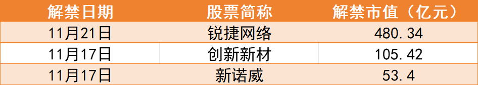 锐捷网络解禁市值最高,达480.34亿元,将有7亿股上市流通,主要为首发原股东限售股份。创新新材的解禁规模次之,解禁市值达105.42亿元,将有22.87亿股上市流通,解禁股主要为定向增发机构配售股份。紧随其后的是,新诺威解禁规模达53.4亿元。