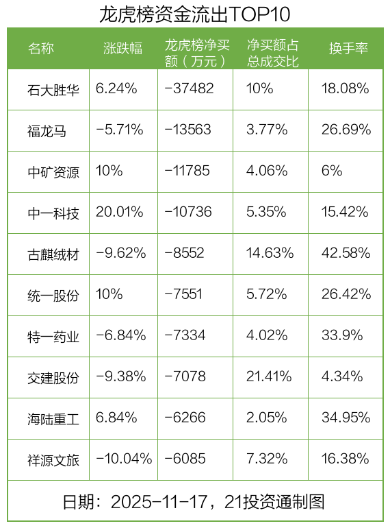 而龙虎榜中资金净流出最多的是石大胜华(603026.SH),被净卖出为3.75亿元,占总成交金额的10%。石大胜华收盘上涨6.24%,换手率为18.08%。