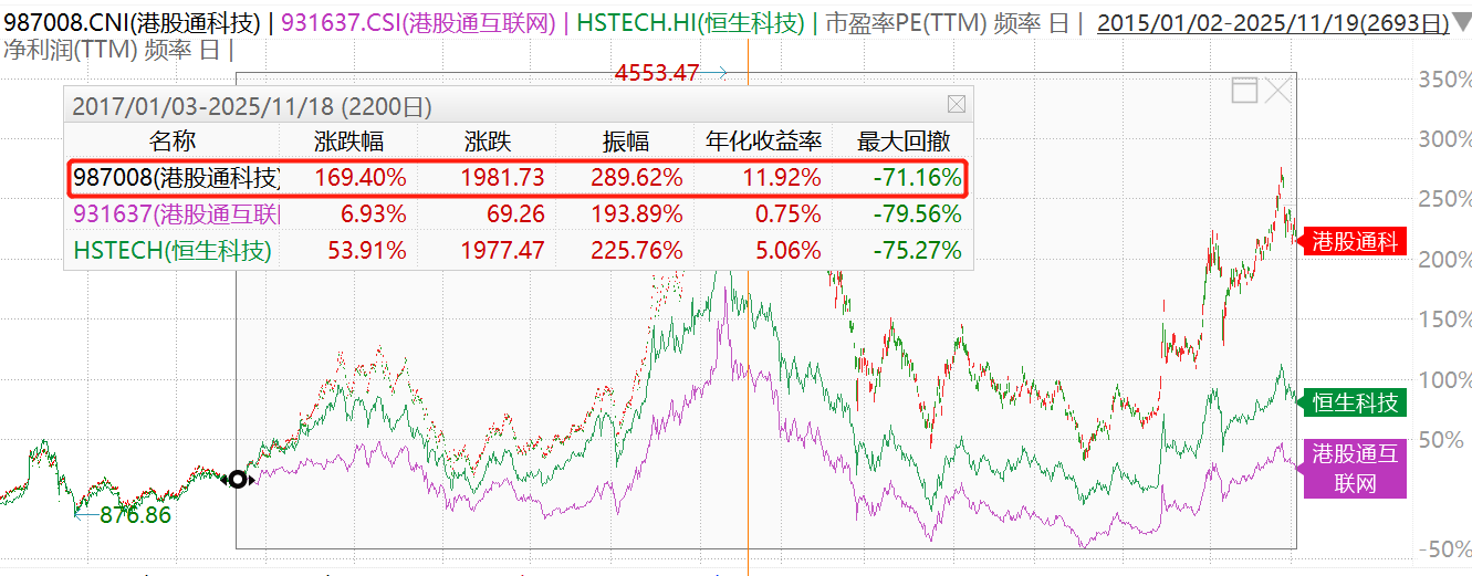 港股通科技ETF招商(159125)跟踪国证港股通科技指数,从港股通范围内精选30家市值领先、研发投入高、营收增长快的科技企业作为成份股,涵盖腾讯控股、阿里巴巴、小米集团、美团、中芯国际、比亚迪股份等细分领域龙头,Wind数据显示,截至2025年11月18日,自2017年以来指数累计收益率达169.40%,大幅跑赢同期中证港股通互联网指数6.93%的涨幅。