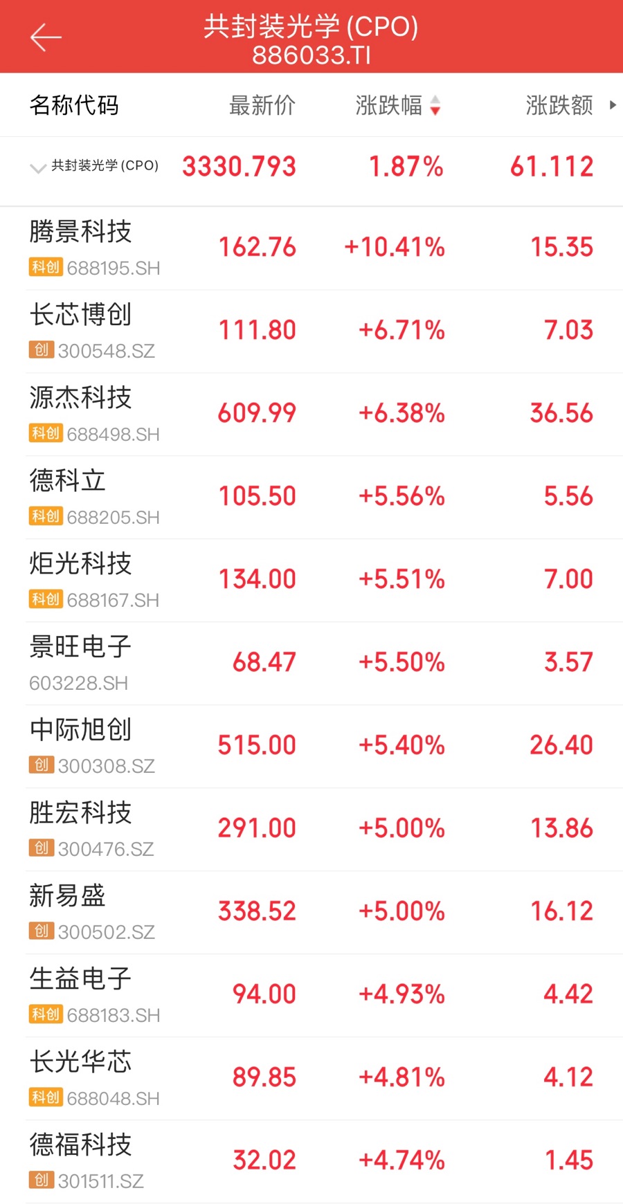 11月20日,A股CPO(共封装光学)概念开盘迎来强势拉升,腾景科技(688195.SH)涨超10%,中际旭创(300308.SZ)、胜宏科技(300476.SZ)、新易盛(300502.SZ)涨超4%,方正科技(600601.SH)、生益电子(688183.SH)等个股同步跟涨。