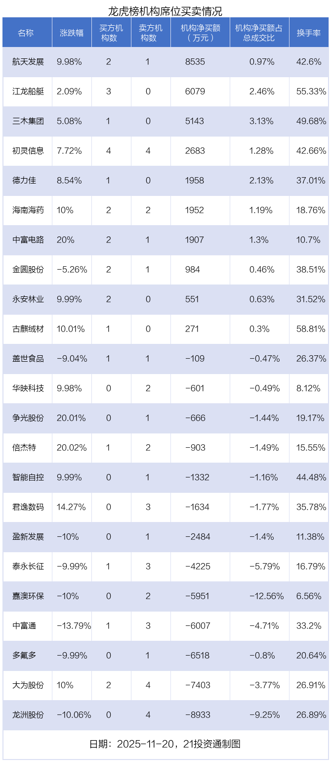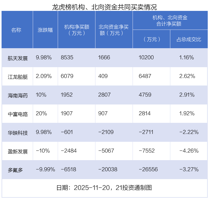 值得注意的是,机构和北向资金共同净买入了海南海药、航天发展、中富电路、江龙船艇等4股;共同净卖出了华映科技、盈新发展、多氟多等3股。