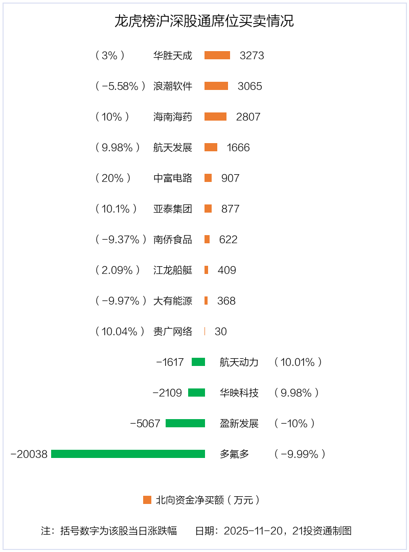 11月20日,北向资金参与龙虎榜中的个股共有14只,合计净卖出1.48亿元。其中沪股通净买入6 股,净卖出1 股,合计净买入6618.66万元;深股通净买入4 股,净卖出3 股,合计净卖出2.14亿元。