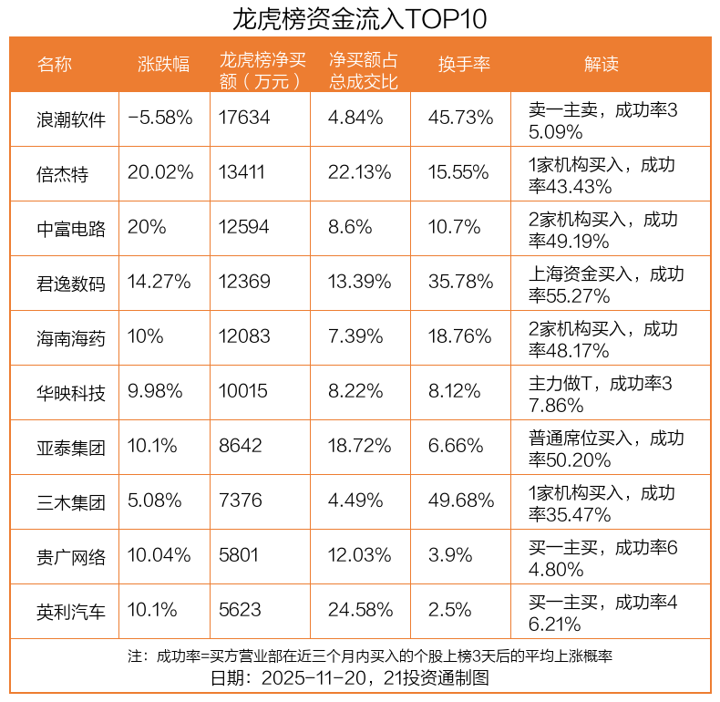 11月20日,上证指数下跌0.4%,深证成指下跌0.76%,创业板指下跌1.12%。盘后龙虎榜数据显示,共有45只个股因当日异动登上龙虎榜,资金净流入最多的是浪潮软件(600756.SH),达1.76亿元。