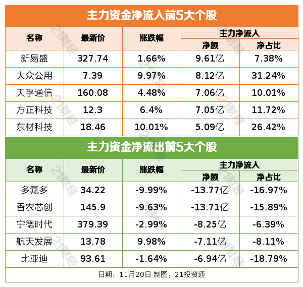 11月20日,市场震荡调整,创业板指跌超1%,此前一度涨超1.5%。截至收盘,沪指跌0.4%,深成指跌0.76%,创业板指跌1.12%。沪深两市成交额1.71万亿,较上一个交易日缩量177亿。