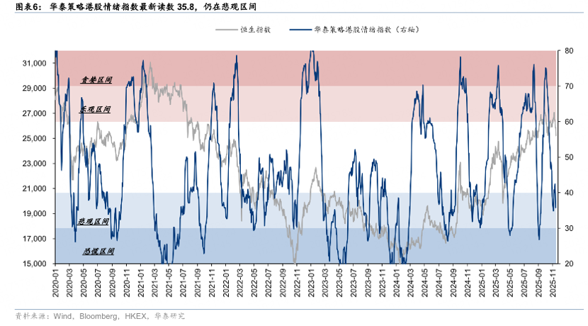 根据华泰证券“港股情绪指数”,截至11月21日收盘,情绪指标为35.8,仍处于悲观区间。