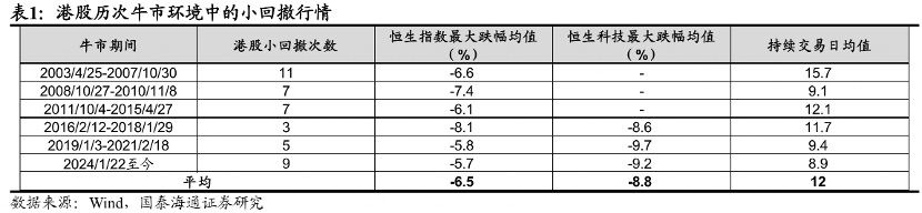 根据国泰海通证券统计,历史上6轮港股行情共20段大回撤行情,以恒生指数为例,在历次大回撤中,恒生指数平均最大跌幅约为17%,平均回撤时长约为53个交易日。港股较大回撤的诱因往往是流动性收紧、实质性利空冲击等。