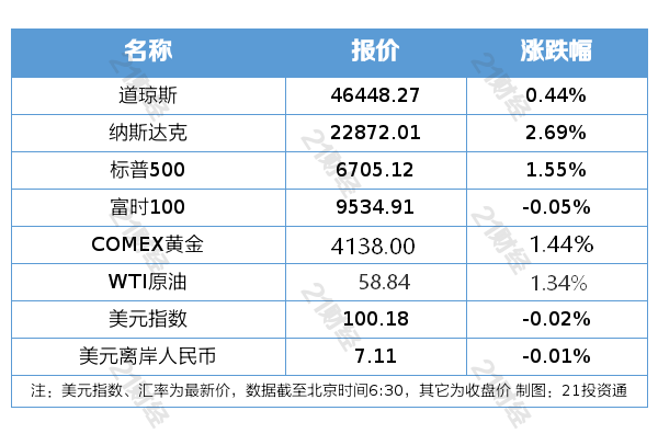 纽约股市三大股指11月24日上涨。截至当天收盘,道琼斯工业平均指数比前一交易日上涨202.86点,收于46448.27点,涨幅为0.44%;标准普尔500种股票指数上涨102.13点,收于6705.12点,涨幅为1.55%;纳斯达克综合指数上涨598.922点,收于22872.01点,涨幅为2.69%。