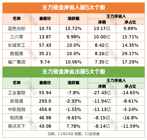11月24日,市场探底回升,三大指数集体收红。截至收盘,沪指涨0.05%,深成指涨0.37%,创业板指涨0.31%。沪深两市成交额1.73万亿,较上一个交易日缩量2379亿。