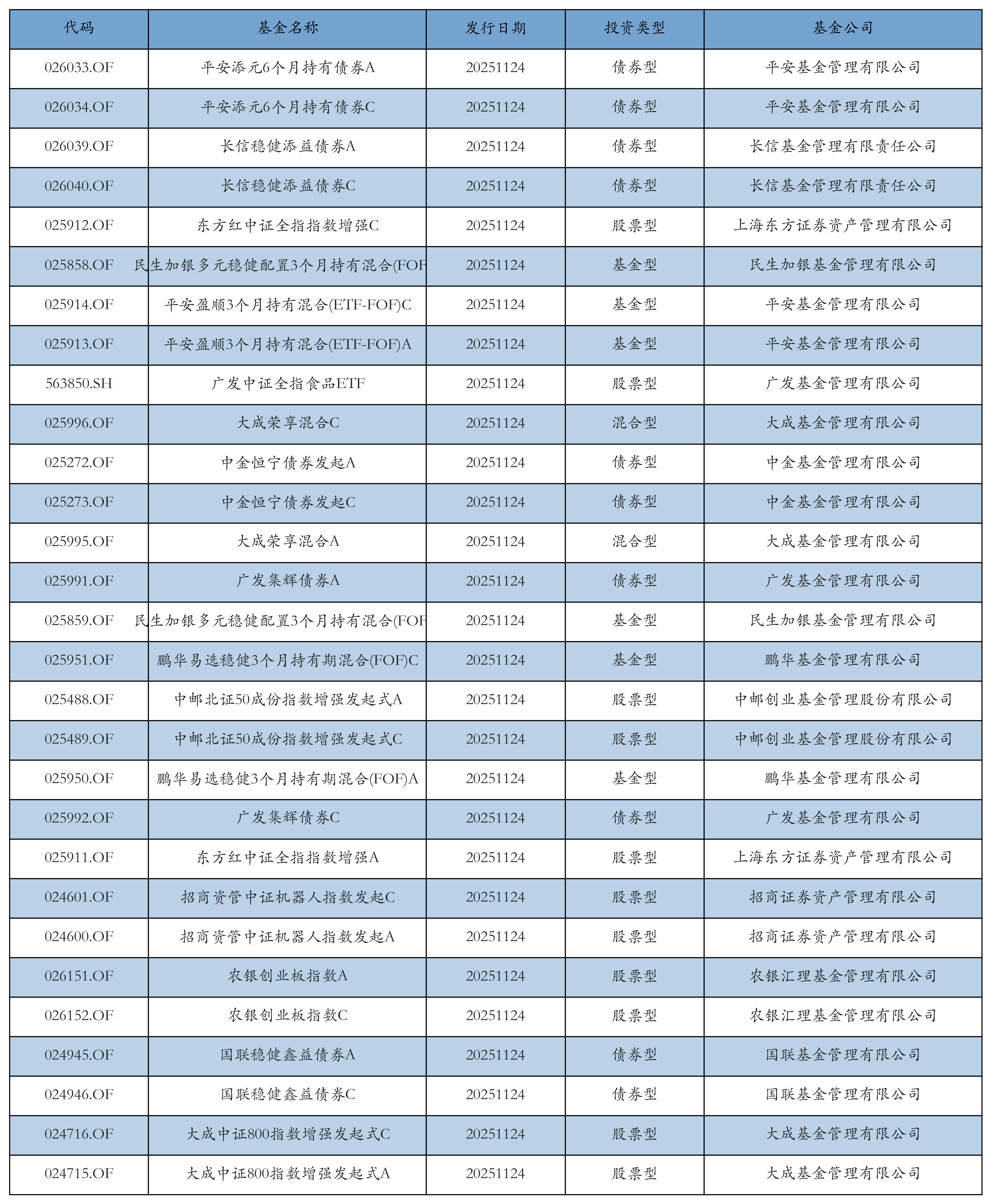 昨日有29只新基金发行,分别为:平安添元6个月持有债券A、平安添元6个月持有债券C、长信稳健添益债券A、长信稳健添益债券C、东方红中证全指指数增强C、民生加银多元稳健配置3个月持有混合(FOF)A、平安盈顺3个月持有混合(ETF-FOF)C、平安盈顺3个月持有混合(ETF-FOF)A、广发中证全指食品ETF、大成荣享混合C、中金恒宁债券发起A、中金恒宁债券发起C、大成荣享混合A、广发集辉债券A、民生加银多元稳健配置3个月持有混合(FOF)C、鹏华易选稳健3个月持有期混合(FOF)C、中邮北证50成份指数增强发起式A、中邮北证50成份指数增强发起式C、鹏华易选稳健3个月持有期混合(FOF)A、广发集辉债券C、东方红中证全指指数增强A、招商资管中证机器人指数发起C、招商资管中证机器人指数发起A、农银创业板指数A、农银创业板指数C、国联稳健鑫益债券A、国联稳健鑫益债券C、大成中证800指数增强发起式C、大成中证800指数增强发起式A,详情见下表: