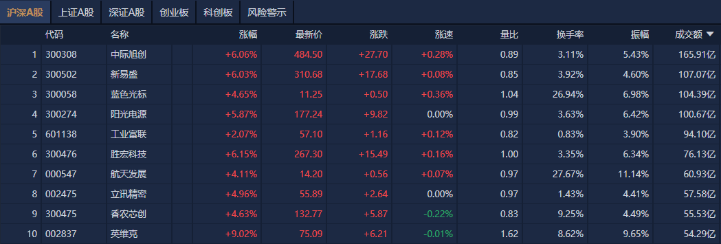 个股方面,中际旭创成交额超165亿元居首,新易盛、蓝色光标、阳光电源成交额靠前。