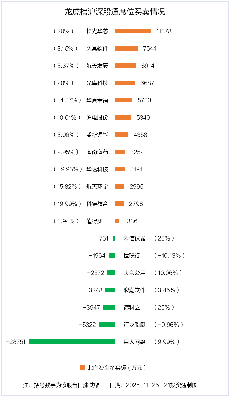 11月25日,北向资金参与龙虎榜中的个股共有19只,合计净买入1.54亿元。其中沪股通净买入4 股,净卖出4 股,合计净买入1.32亿元;深股通净买入8 股,净卖出3 股,合计净买入2192.94万元。