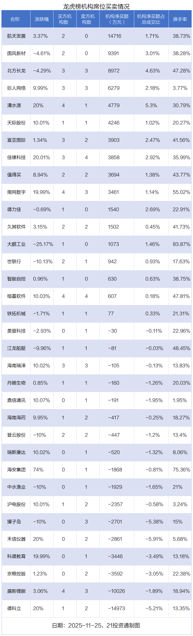 11月25日,34只个股龙虎榜出现了机构的身影,机构合计净买入2.4亿元。具体来看,机构净买入17股,净卖出17股。