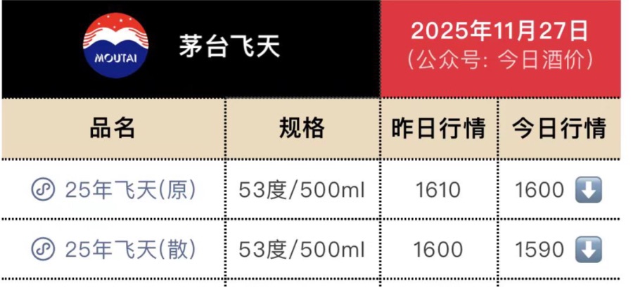 曾经一酒难求的飞天茅台正经历价格“滑铁卢”。11月27日,据第三方平台“今日酒价”数据,2025年53度500ml飞天茅台散瓶批发参考报价1590元,较前一日下跌10元,首次跌破1600元/瓶大关,创上市以来新低。原箱报1600元,较前一日下跌10元。两款产品较上线时的2220元、2255元累计跌幅均已超过20%。