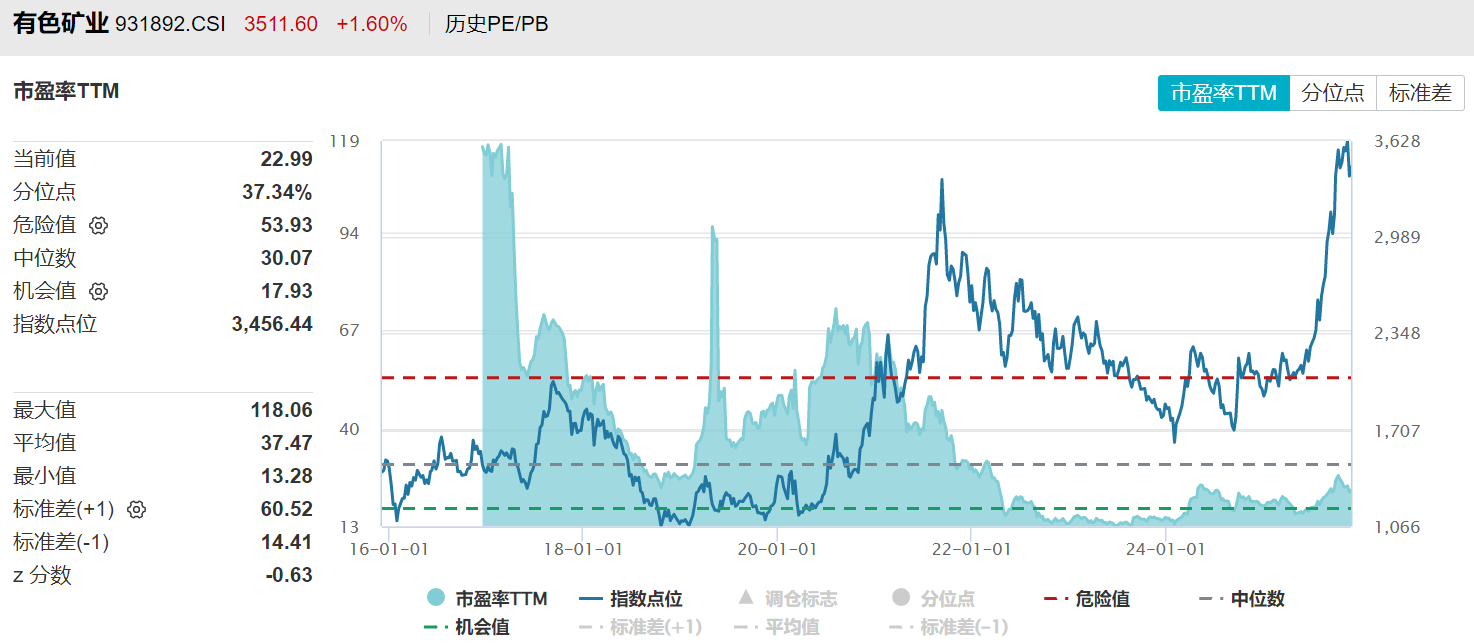 从板块估值来看,中证有色金属矿业指数最新估值22.99倍PE-TTM,位于37%历史分位数,年内估值扩张约24%。