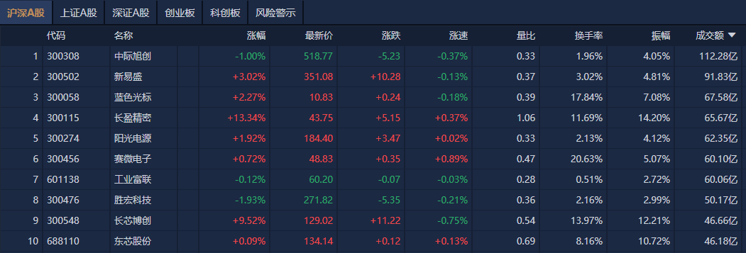 个股方面,中际旭创成交额超112亿元居首,新易盛、蓝色光标、长盈精密成交额靠前。