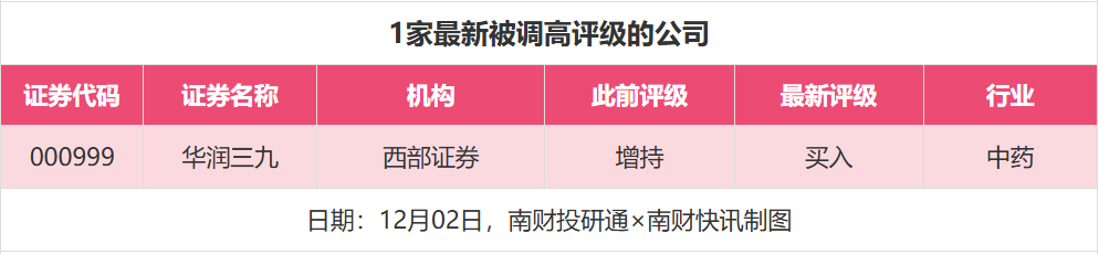评级调高方面,12月2日,券商调高上市公司评级达到1家次,最新数据包括了西部证券对华润三九的评级从“增持”调高至“买入”。