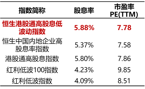 具体来看,截至12月2日,恒生港股通?股息低波动指数股息率(近12月发布方股息率,下同)为5.88%,在同类红利类指数中相对更高;市盈率7.78倍PE(TTM),估值相对较低。