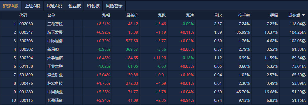 个股方面,三花智控成交额超118亿元居首,航天发展、中际旭创、新易盛成交额靠前。