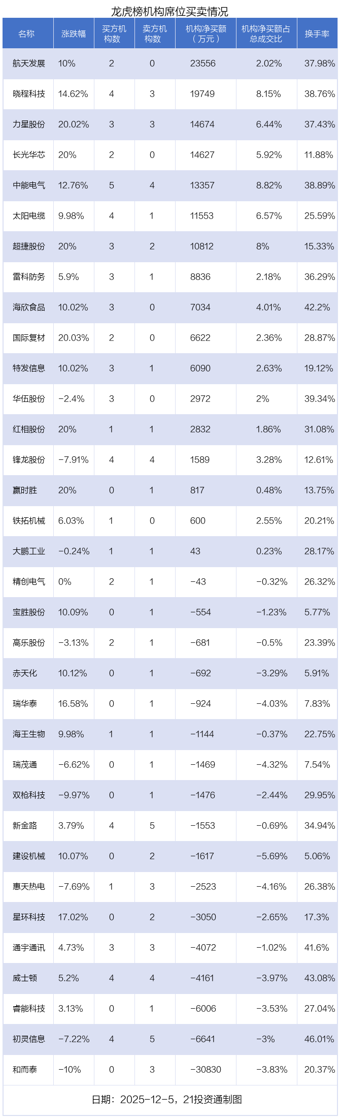 12月5日,34只个股龙虎榜出现了机构的身影,机构合计净买入7.83亿元。具体来看,机构净买入17股,净卖出17股。