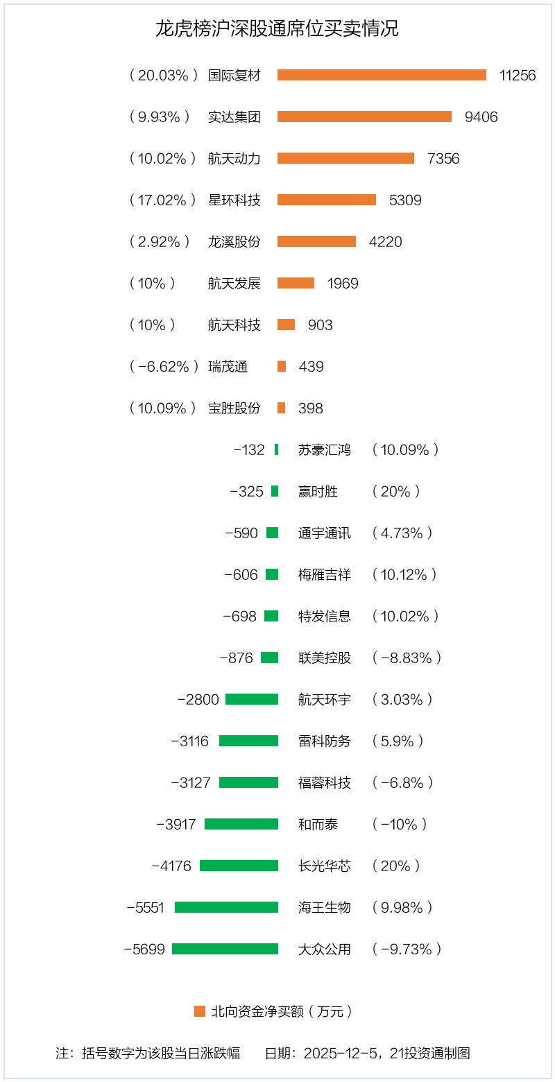 12月5日,北向资金参与龙虎榜中的个股共有22只,合计净买入9641.04万元。其中沪股通净买入6 股,净卖出7 股,合计净买入9712.25万元;深股通净买入3 股,净卖出6 股,合计净卖出71.21万元。