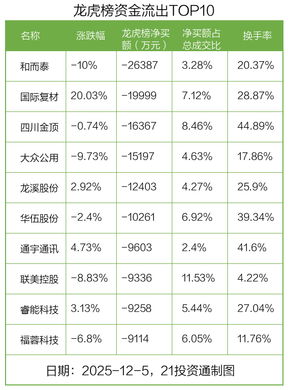 而龙虎榜中资金净流出最多的是和而泰(002402.SZ),被净卖出为2.64亿元,占总成交金额的3.28%。和而泰收盘下跌10%,换手率为20.37%。