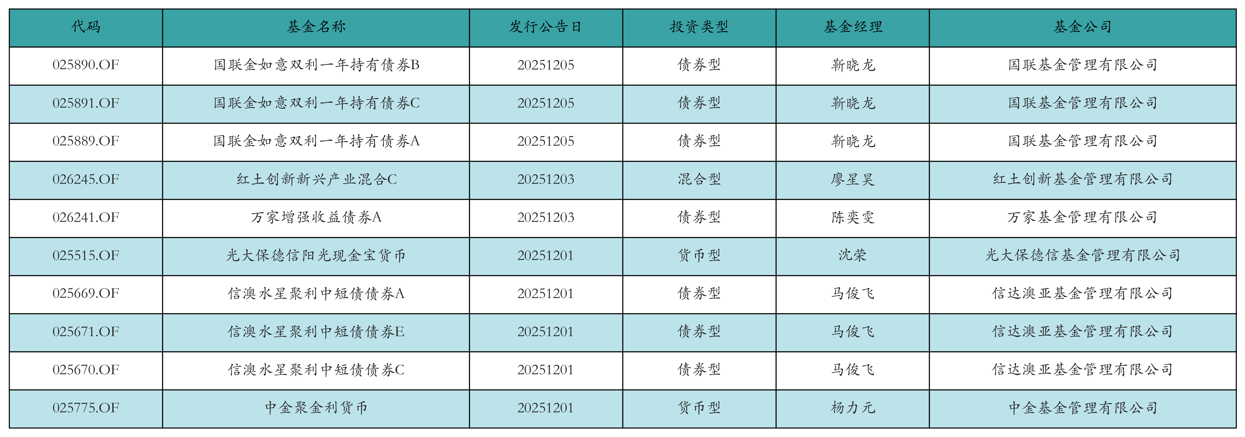 上周有10只新基金发行,分别为:国联金如意双利一年持有债券B、国联金如意双利一年持有债券C、国联金如意双利一年持有债券A、红土创新新兴产业混合C、万家增强收益债券A、光大保德信阳光现金宝货币、信澳水星聚利中短债债券A、信澳水星聚利中短债债券E、信澳水星聚利中短债债券C、中金聚金利货币,详情见下表: