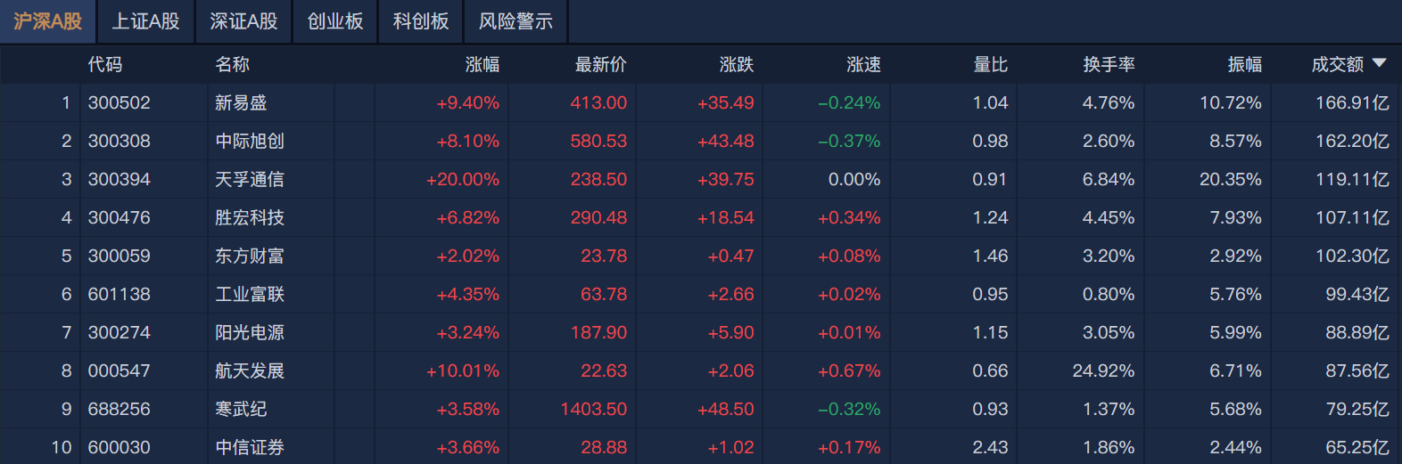 南财金融终端显示,个股方面,新易盛半日成交额超166亿元居首,中际旭创、天孚通信、胜宏科技成交额靠前。