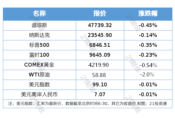 纽约股市三大股指12月8日下跌。截至当天收盘,道琼斯工业平均指数比前一交易日下跌215.67点,收于47739.32点,跌幅为0.45%;标准普尔500种股票指数下跌23.89点,收于6846.51点,跌幅为0.35%;纳斯达克综合指数下跌32.22点,收于23545.90点,跌幅为0.14%。