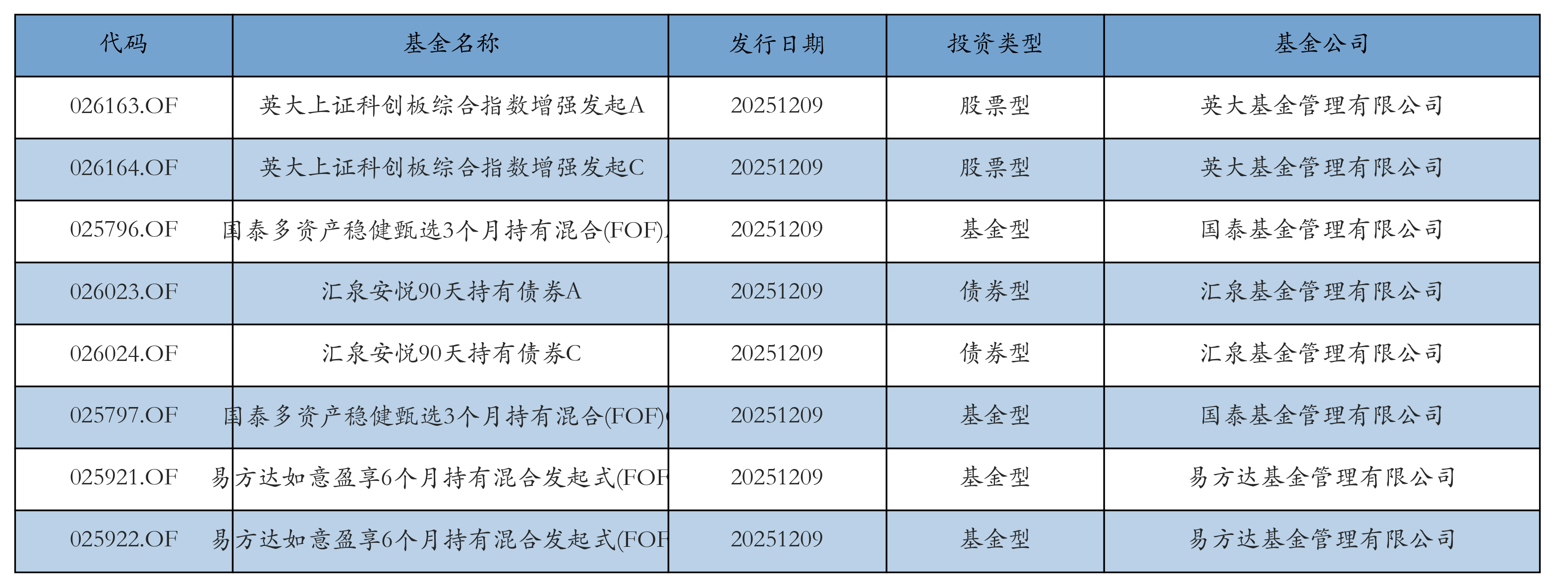 昨日有8只新基金发行,分别为:英大上证科创板综合指数增强发起A、英大上证科创板综合指数增强发起C、国泰多资产稳健甄选3个月持有混合(FOF)A、汇泉安悦90天持有债券A、汇泉安悦90天持有债券C、国泰多资产稳健甄选3个月持有混合(FOF)C、易方达如意盈享6个月持有混合发起式(FOF)A、易方达如意盈享6个月持有混合发起式(FOF)C,详情见下表: