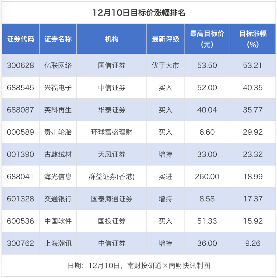 南财投研通数据显示,12月10日,券商给予上市公司目标价共9次,按最新收盘价计算,目标价涨幅排名居前的公司有亿联网络、兴福电子、英科再生,目标价涨幅分别为53.21%、40.35%、35.77%,分别属于通信设备、电子化学品、塑料行业。