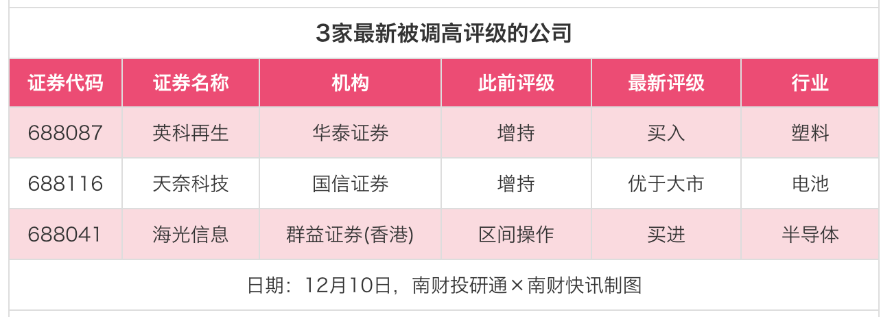 评级调高方面,12月10日,券商调高上市公司评级达到3家次,最新数据包括了华泰证券对英科再生的评级从“增持”调高至“买入”,国信证券对天奈科技的评级从“增持”调高至“优于大市”,群益证券(香港)对海光信息的评级从“区间操作”调高至“买进”。