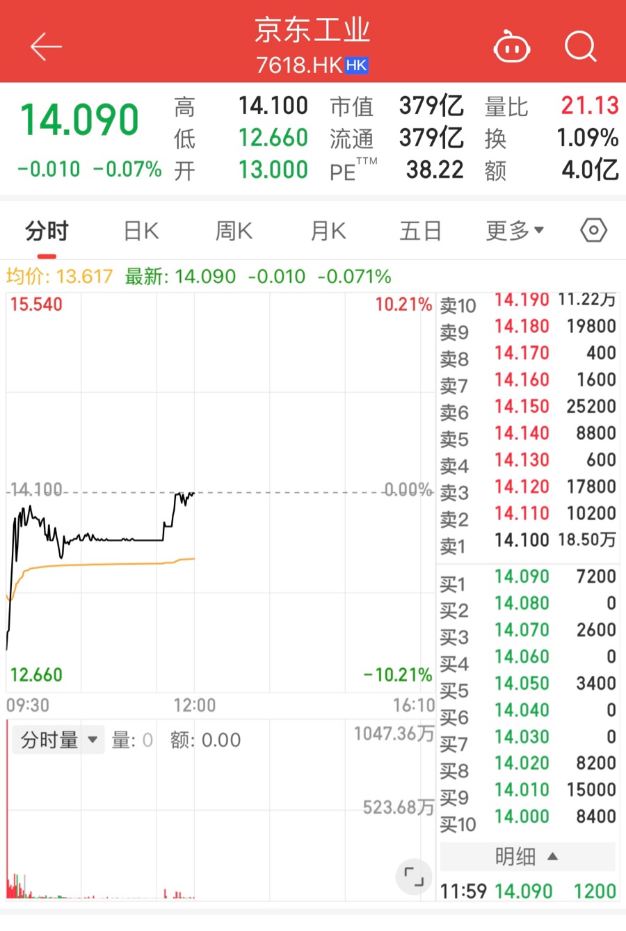 然而,市场期待的“开门红”并未如期而至。京东工业开盘即跌破发行价,以13.0港元/股低开,较14.1港元的发行价下跌7.8%。截至午盘,京东工业股价小幅回升至14.09港元,跌幅收窄至0.07%,但仍未收复发行价失地。