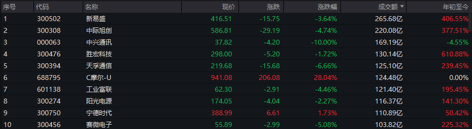 个股方面,新易盛成交额265.68亿元居首,中际旭创、中兴通讯、胜宏科技等成交额考前。