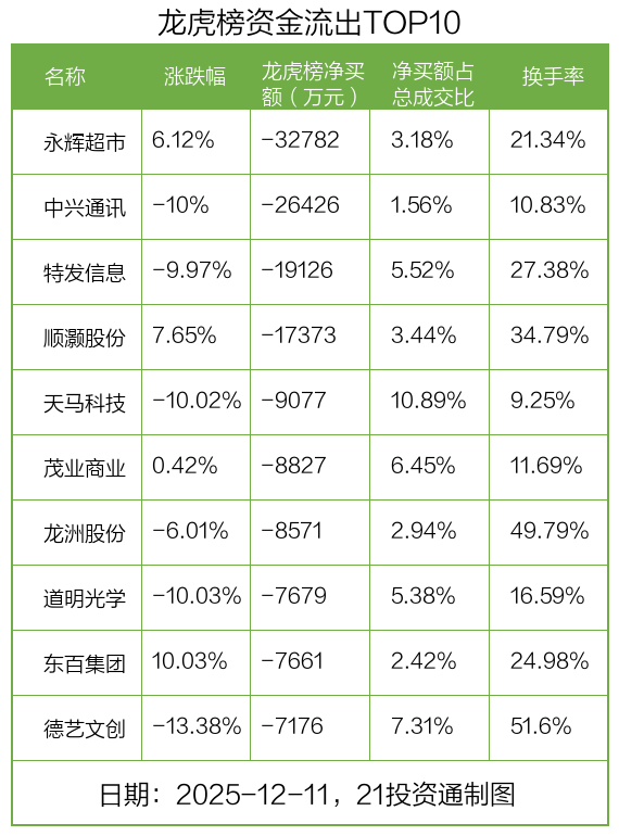 而龙虎榜中资金净流出最多的是永辉超市(601933.SH),被净卖出为3.28亿元,占总成交金额的3.18%。永辉超市收盘上涨6.12%,换手率为21.34%。