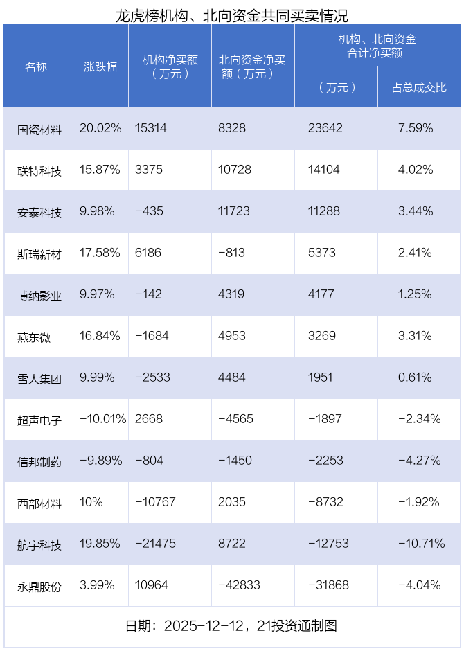 其中,机构净买入金额最多的是国瓷材料(300285.SZ),当日收盘上涨20.02%,换手率为13.75%。