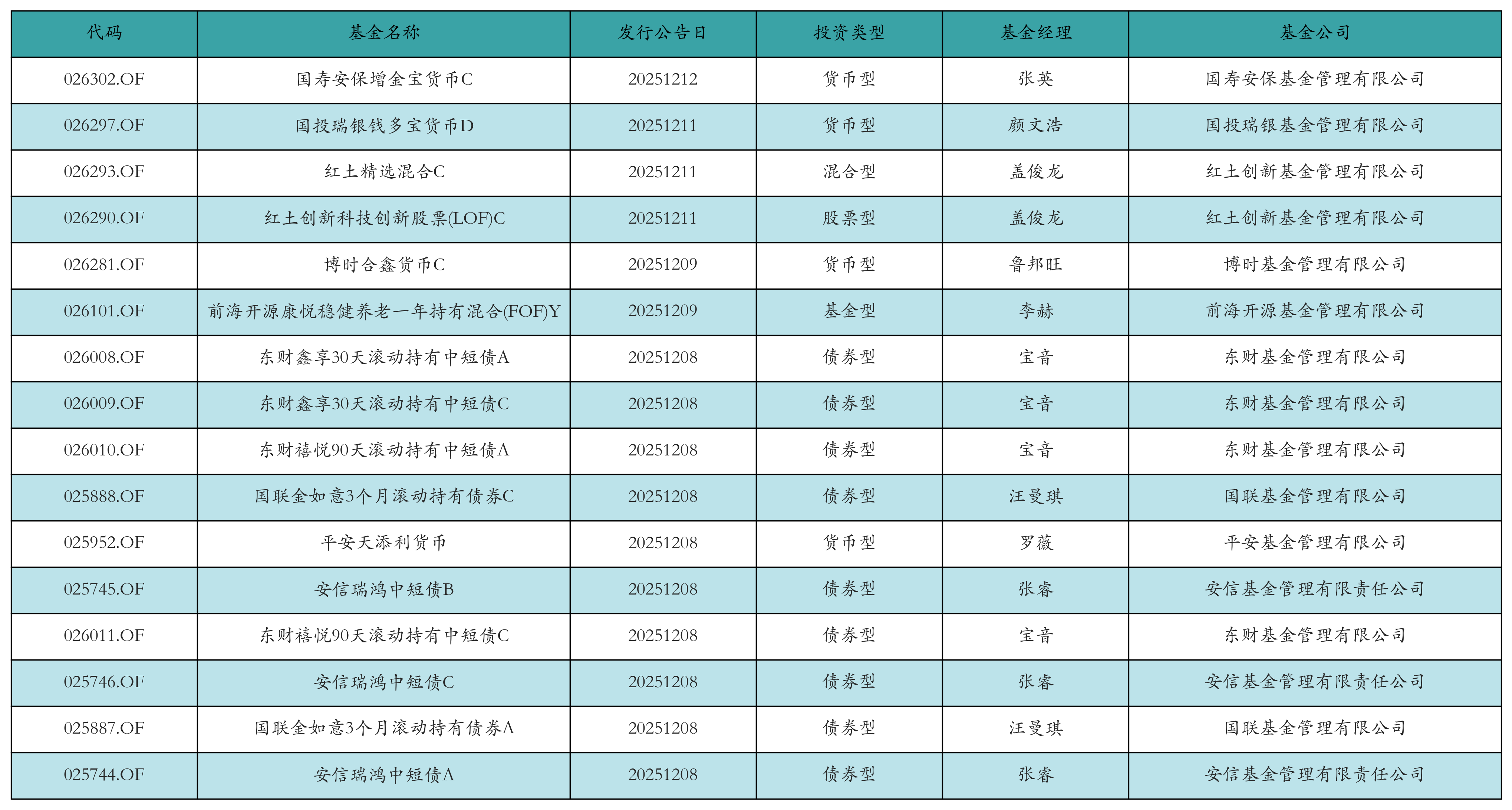 上周有16只新基金发行,分别为:国寿安保增金宝货币C、国投瑞银钱多宝货币D、红土精选混合C、红土创新科技创新股票(LOF)C、博时合鑫货币C、前海开源康悦稳健养老一年持有混合(FOF)Y、东财鑫享30天滚动持有中短债A、东财鑫享30天滚动持有中短债C、东财禧悦90天滚动持有中短债A、国联金如意3个月滚动持有债券C、平安天添利货币、安信瑞鸿中短债B、东财禧悦90天滚动持有中短债C、安信瑞鸿中短债C、国联金如意3个月滚动持有债券A、安信瑞鸿中短债A,详情见下表: