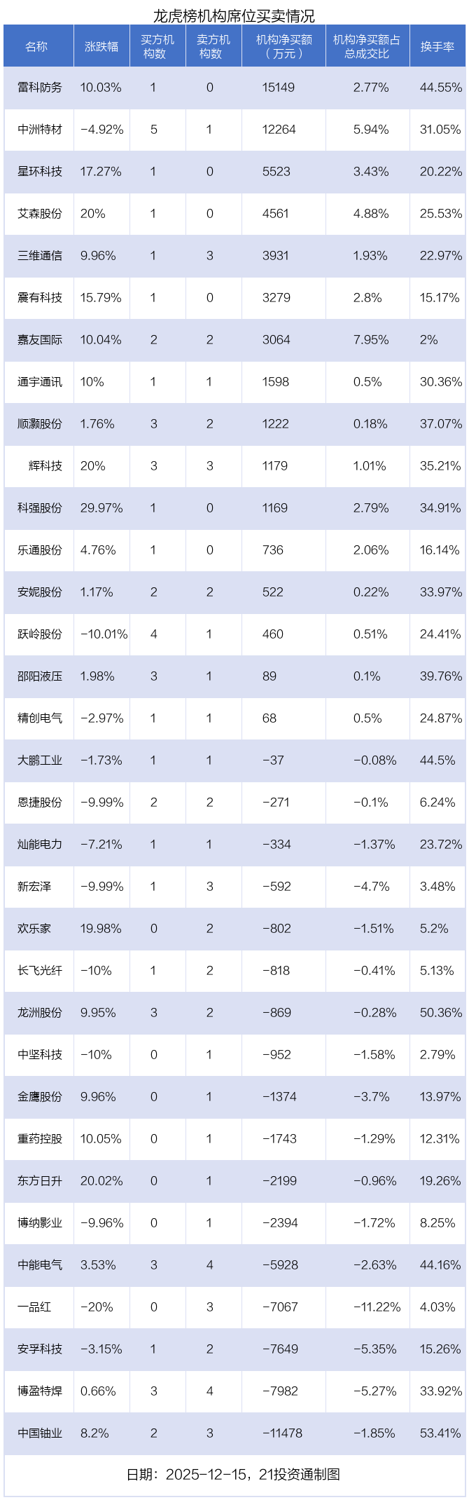 12月15日,33只个股龙虎榜出现了机构的身影,机构合计净买入2325.97万元。具体来看,机构净买入16股,净卖出17股。