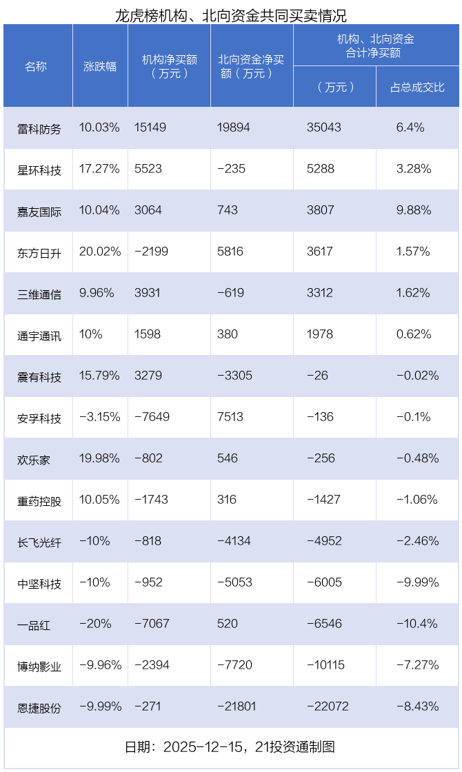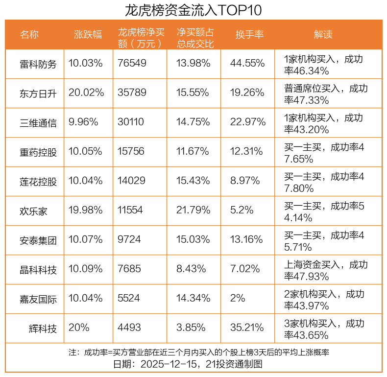 12月15日,上证指数下跌0.55%,深证成指下跌1.1%,创业板指下跌1.77%。盘后龙虎榜数据显示,共有54只个股因当日异动登上龙虎榜,资金净流入最多的是雷科防务(002413.SZ),达7.65亿元。