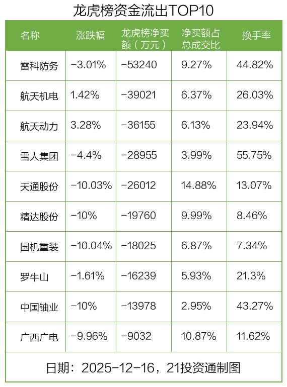 而龙虎榜中资金净流出最多的是雷科防务(002413.SZ),被净卖出为5.32亿元,占总成交金额的9.27%。雷科防务收盘下跌3.01%,换手率为44.82%。